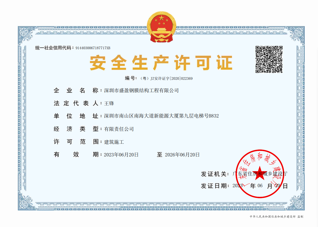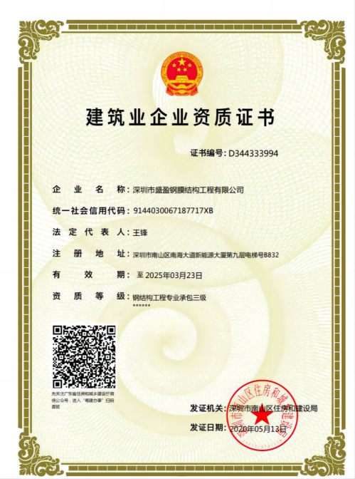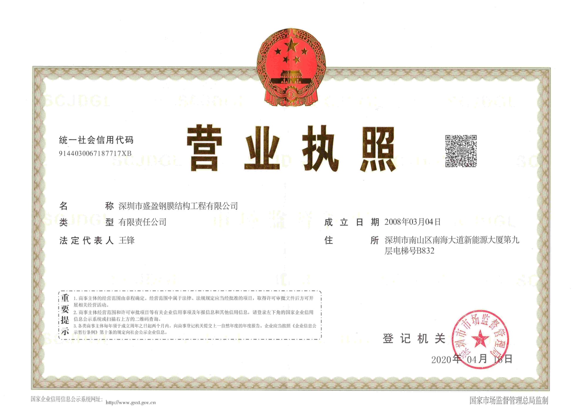 深圳市盛盈鋼膜結(jié)構(gòu)工程有限公司是一家服務(wù)于膜結(jié)構(gòu)工程領(lǐng)域的專業(yè)公司,是中國鋼結(jié)構(gòu) 協(xié)會空間結(jié)構(gòu)分會會員單位,擁有中國膜結(jié)構(gòu)行業(yè)協(xié)會頒發(fā)膜結(jié)構(gòu)專項資質(zhì)(三項壹級資質(zhì))及建設(shè)部頒發(fā)鋼結(jié)構(gòu)專業(yè)承包壹級資質(zhì),同時亦是廣東省空間結(jié)構(gòu)學(xué)會理事單位。盛盈公司設(shè)有鋼結(jié)構(gòu)專業(yè)加工基地及年產(chǎn)60萬平方米膜結(jié)構(gòu)加工廠。